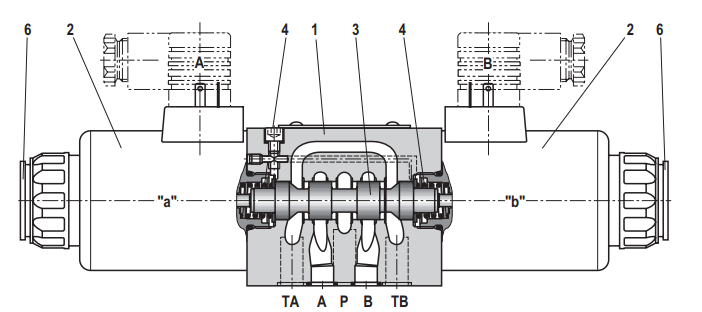 Sau khi ngắt điện cuộn solenoid (2), lõi trượt (3) được đẩy trở lại vị trí trung tâm của nó hoặc về vị trí ban đầu của nó (ngoại trừ van có chốt chặn “OF” và van không có lò xo loại “O”).